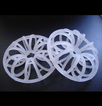 花环填料的主要特点是填料的空隙率大,不易被堵塞,还有通量大、阻力小等优点,花环填料也称梅花环填料是由许多圆环结绕而成,由于填料的空隙处能有较高的持液量,由于这种填料的间隙处能有较高的滞液量,可使塔内液体停留时间较长,从而增加了气液的接触时间,提高了填料的传质效率。聚丙烯(PP)花环填料具有空隙率大,压降和传质单元高度低,泛点高,汽液接触充分,比重小,传质效率高等特点,多用于气体洗涤、净化塔中。
