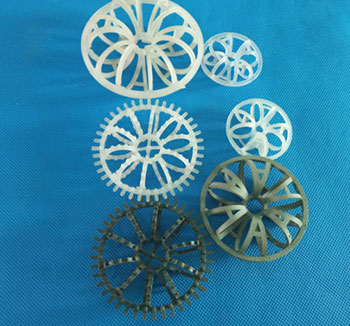 花环填料具有隙空率大、不易堵塞、通量大、阻力小等特点。由于花环填料的表面并不是光滑的,它的间隙处有较高的滞液量,可使塔内液体停留时间较长,从而增加了气液的接触时间,提高了效率。
